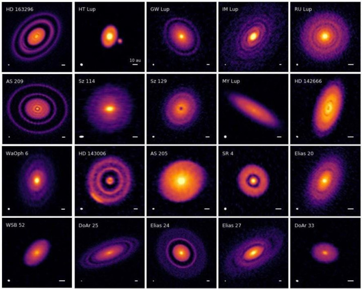 由高角辞别率名堂(DSHARP)盘子结构测量的20个年青幼星原行星盘样本。这些不雅测告诉咱们,原行星盘主要酿成在单一平面,倾向于守旧行星酿成的中枢吸积现象。盘状结构可在红外和毫米/亚毫米波段不雅察到。咱们最近了解到,原行星盘在大略0.5万至200万年后启动酿成缺点,而较年青的盘则莫得这种亚结构。这些盘往往在约1~000万年后磨灭,转为碎片盘系统,届时行星酿成瞻望将完成。碎片盘不错捏续数亿年。