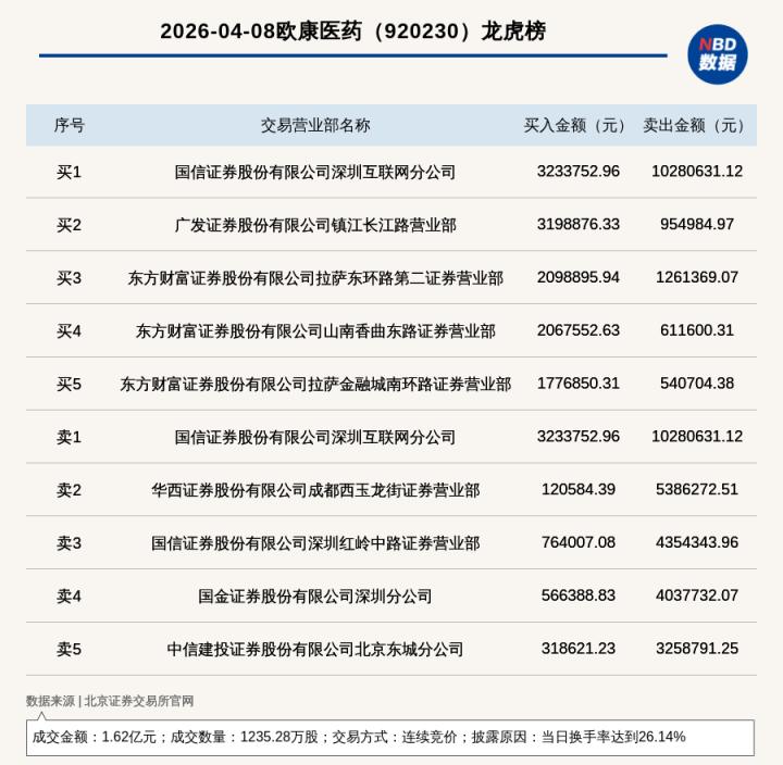 每经讯,2026年4月8日,北交所上市公司欧康医药(920230,收盘价:12.98元)登上龙虎榜,交游样子是聚首竞价,开云体育官方网站泄露原因是当日换手率达到26.14%,成交数目1235.28万股,成交金额1.62亿元。买一席位为国信证券股份有限公司深圳互联网分公司,买入323.38万元;卖一席位为国信证券股份有限公司深圳互联网分公司,卖出1028.06万元。