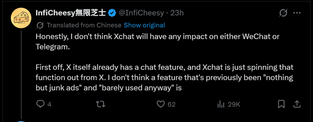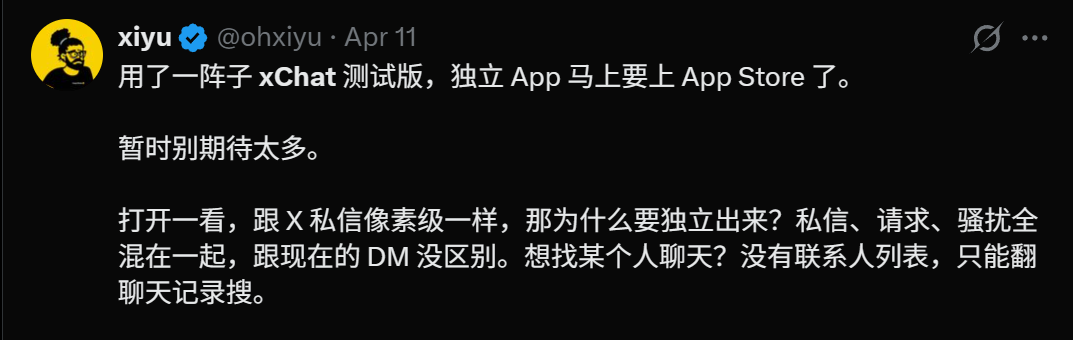 XChat亮相后,一条批驳被一众网友顶到前排,论断也很径直:
