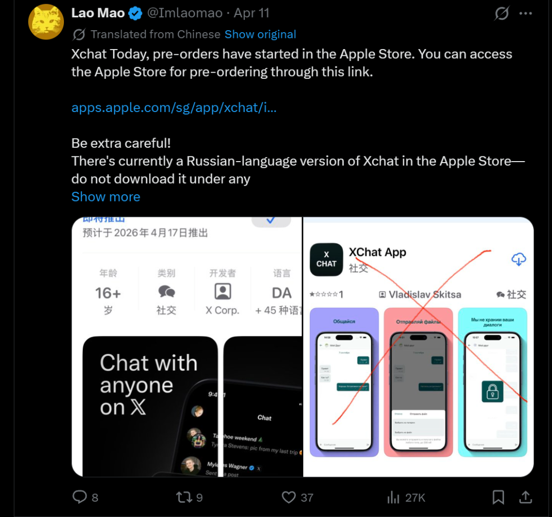 XChat是X公司推出的下一代端到端加密通信诳骗。用户的每一条音问,王人将以加密体式存在于缔造之间,而非平台自身。