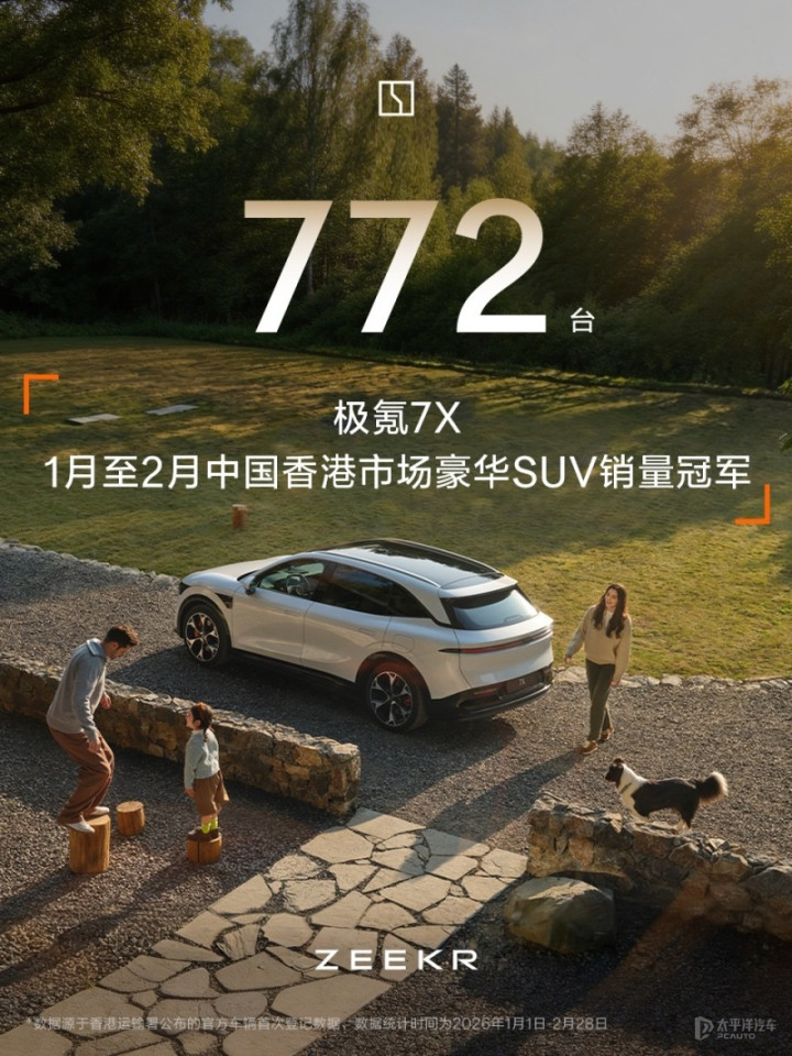 日前,极氪汽车官方晓示,证明香港交通署公布的最新统计数据,旗下纯电中型SUV——极氪7X在2026年1月至2月累计销量达772台,生效登顶中国香港豪华SUV销量冠军。