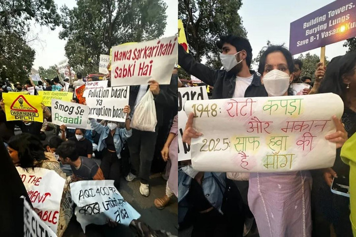 有的写着“SmogSeAzaadi”(从雾霾中目田),有的写着“1948:रोटीकपड़ाऔरमकान;2025:साफ़हवाकीहैमाँग”[“昔时,东谈主们向国度要求食品、一稔与住房;今天,咱们不得不要求干净的空气。”这是印度政事话语中极具艳丽性的经典标语:食品(Roti)、衣物(Kapda)、住房(Makaan),在孤独后的几十年里,它常被政党用作甘愿基本民生保险的典型抒发],致使有的写着“THESTATEISPOSIONINGUS”。话语抒发不热烈,却精确地指向一个共同的执行:
