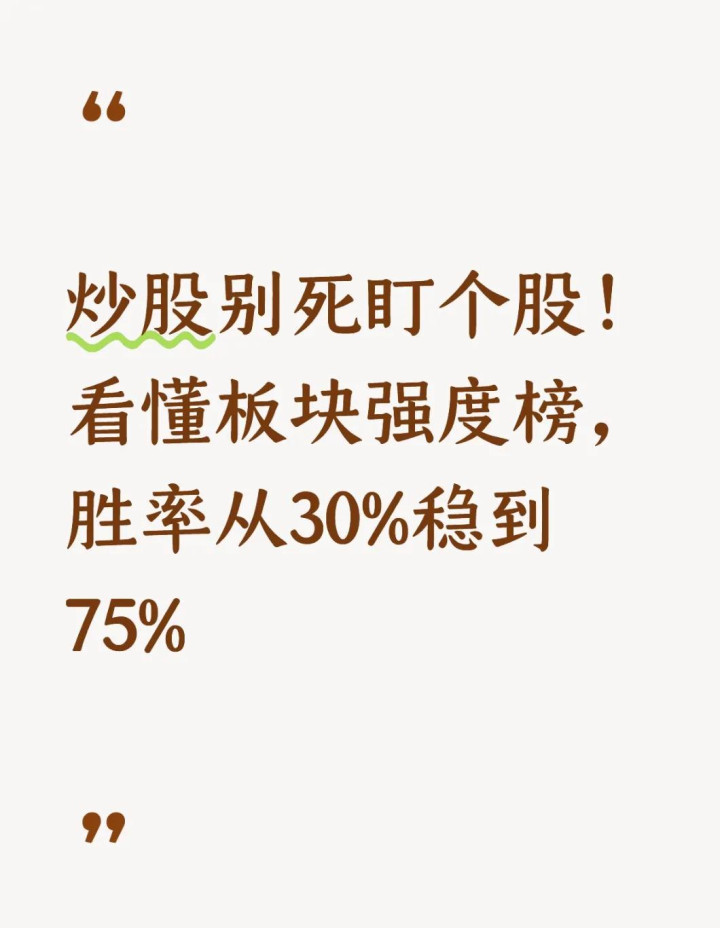 畴昔死盯个股,每天惶恐不安,胜率忽高忽低,完全靠运谈;当今盯板块强度榜,想路了了:先选对标的,再挑好个股,趁势而为。