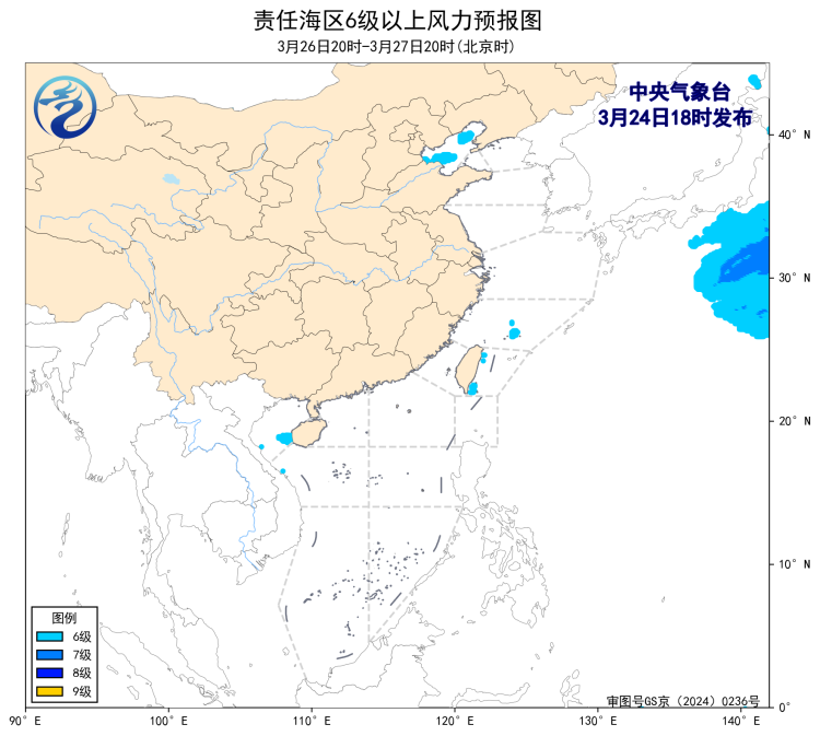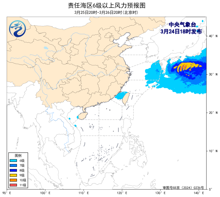24日20时至25日20时,东海北部海域将有6~7级、阵风8级的偏北风,东海南部海域将有5~6级、阵风7级的西南风转西北风。黄海北部和中部海域将有能见度不及10公里的轻雾。
