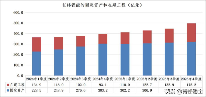 2025年4季度,亿纬锂能在建工程单季环比大幅增长42.3亿元,从3季度的132.9亿元攀升至175.2亿元,环比增幅高达31.8%,创下2024年以来的单季最高增量,是全年产能干涉的中枢发力点。