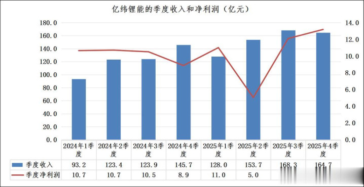 从季度走势来看,2025年亿纬锂能营收逐季抬升,全年呈现“前低后高”的增长节律,4季度营收看护在160亿元以上的高位平台;净利润则在2季度“触底”后,3、4季度连系两个季度闭幕环比增长,4季度单季净利润创下2024年以来的新高,盈利拐点明确。